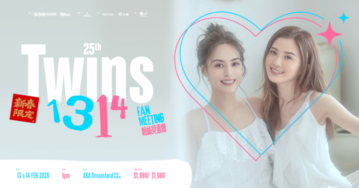 2026/02/13 13:00(+0800)Twins 25周年.1314 「新春限定」Fan Meeting 今年Twins將迎來出道二十五週年的重要時刻,阿Sa同阿嬌將以全新的形式爲大家帶來一場前所未有的「25週年1314新春限定」粉絲見面會!2001年從《明愛暗戀補習社》開始的青春悸動,經歷了《女校男生》和《戀愛大過天立即購票 -